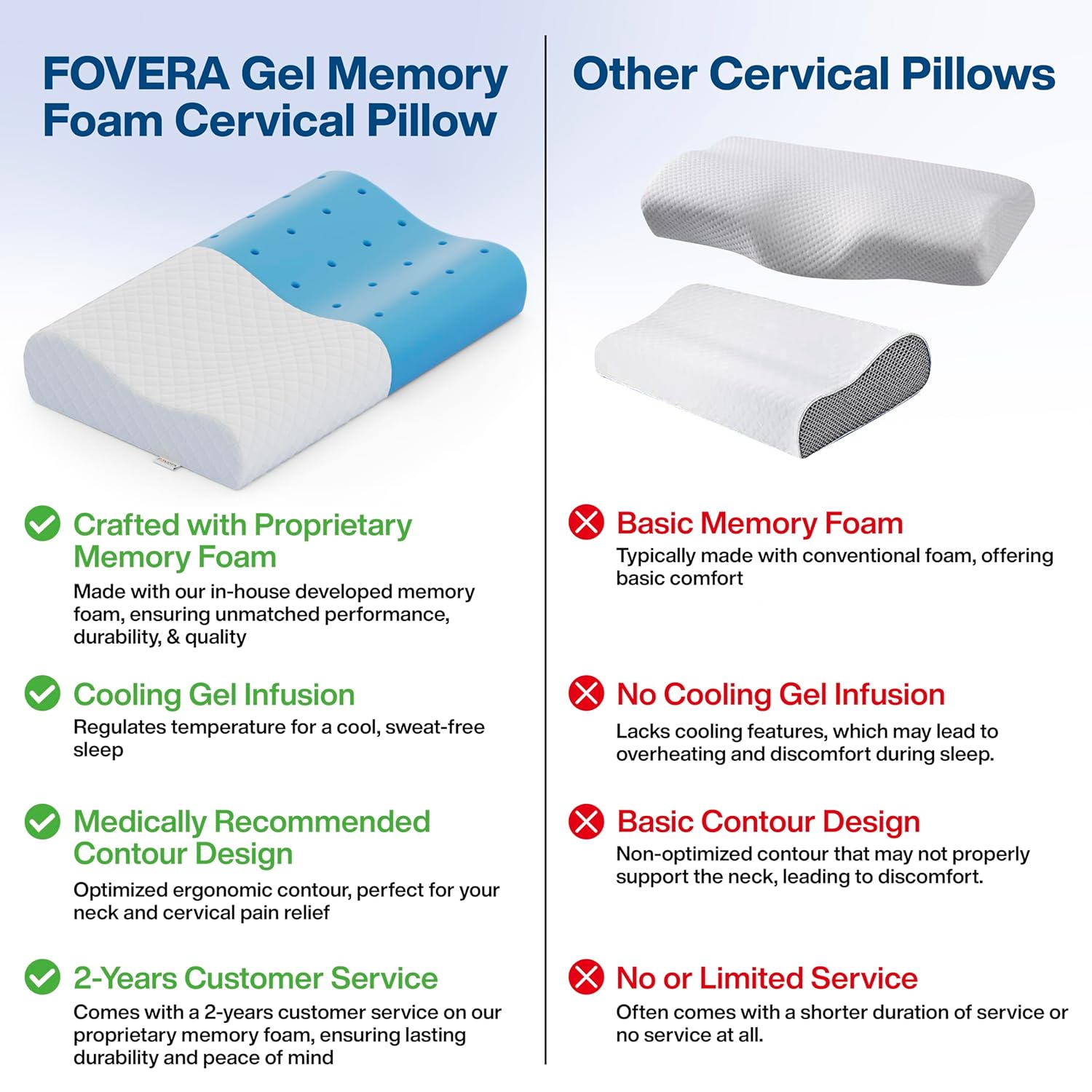 - CONTOURED ERGONOMIC DESIGN: The FOVERA contoured cervical memory foam pillow is designed to conform to the shape of your neck. The pillow fits into the cervical curve and provides maximum neck support and helps reduce neck pain.