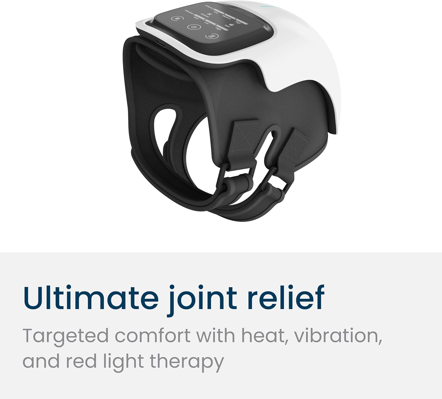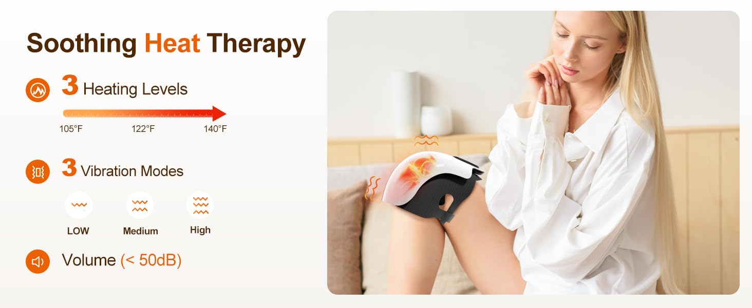 - 3 IN 1 CORDLESS KNEE MASSAGER- Relieves pain and discomfort, designed to promote adequate blood circulation, rejuvenate knees, and reduce fatigue and heaviness. This knee massager features 3 vibration modes that automatically switch from low to high, and 3 heating modes from a low setting of 105°F, a medium setting of 122°F, and a high heat level of up to 140°F, and all with Added bonus is switchable infrared and laser illumination.