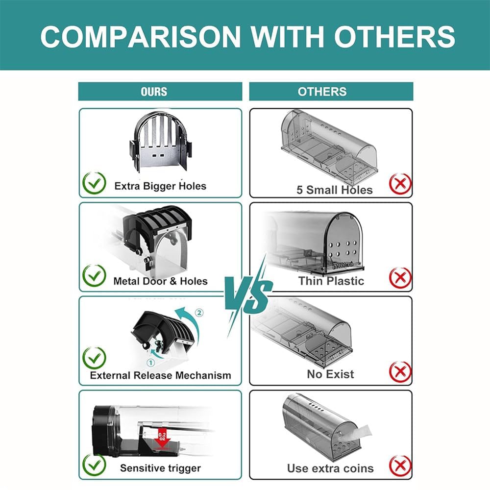 - Humane Rat Trap Effective Design: The mouse trap is eco-friendly and humane. It measures 12 inches and is made of strong ABS plastic with an upgraded touch-sensitive lever. The trap has enough space and ventilation pores for a mouse to remain alive inside a corrosion-resistant metal door trap.