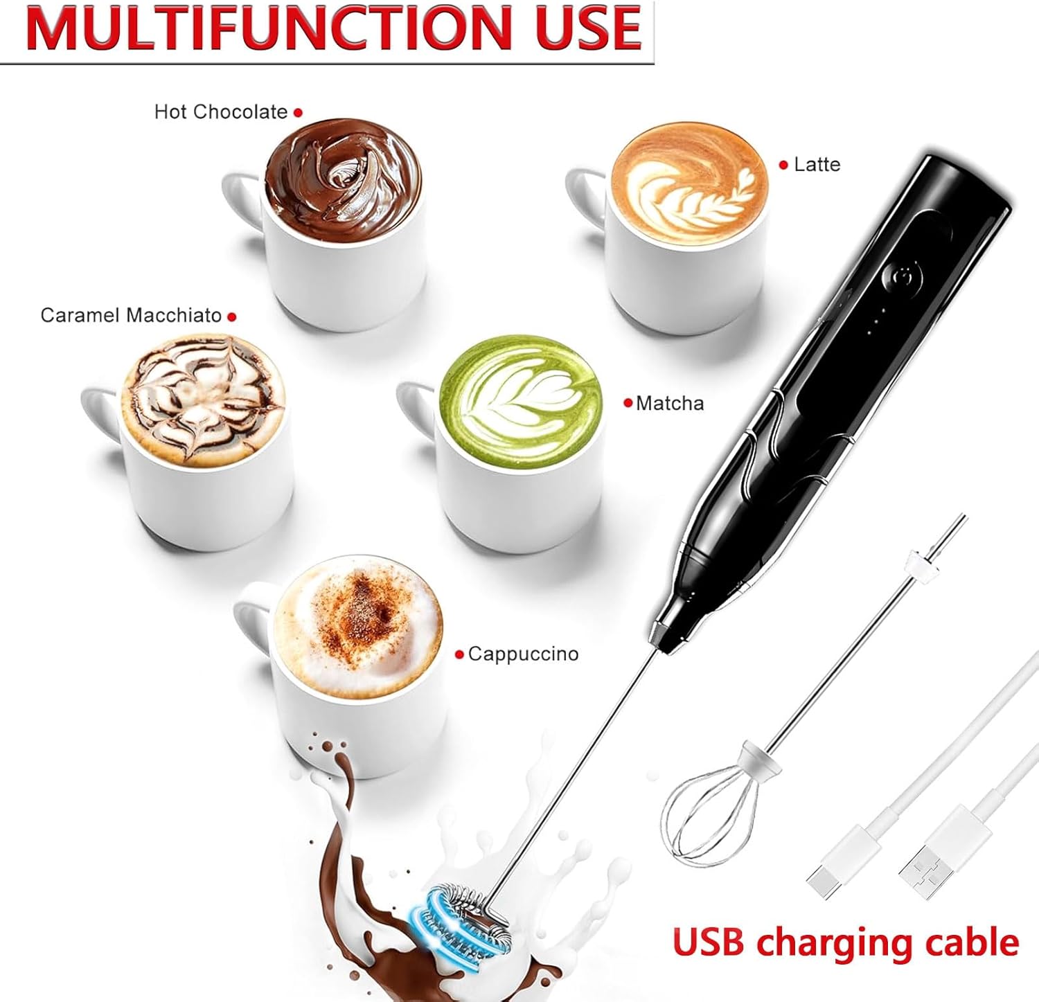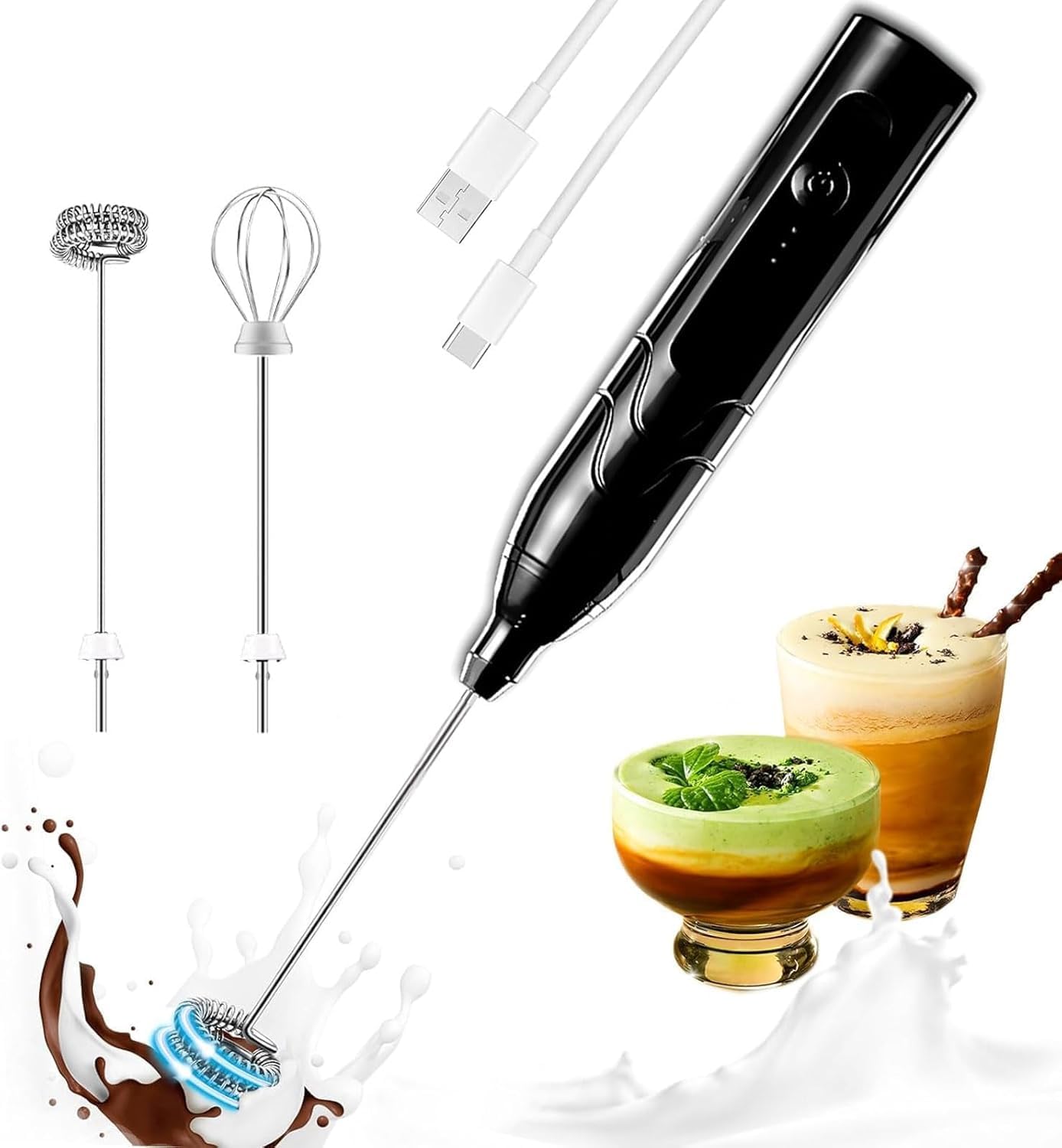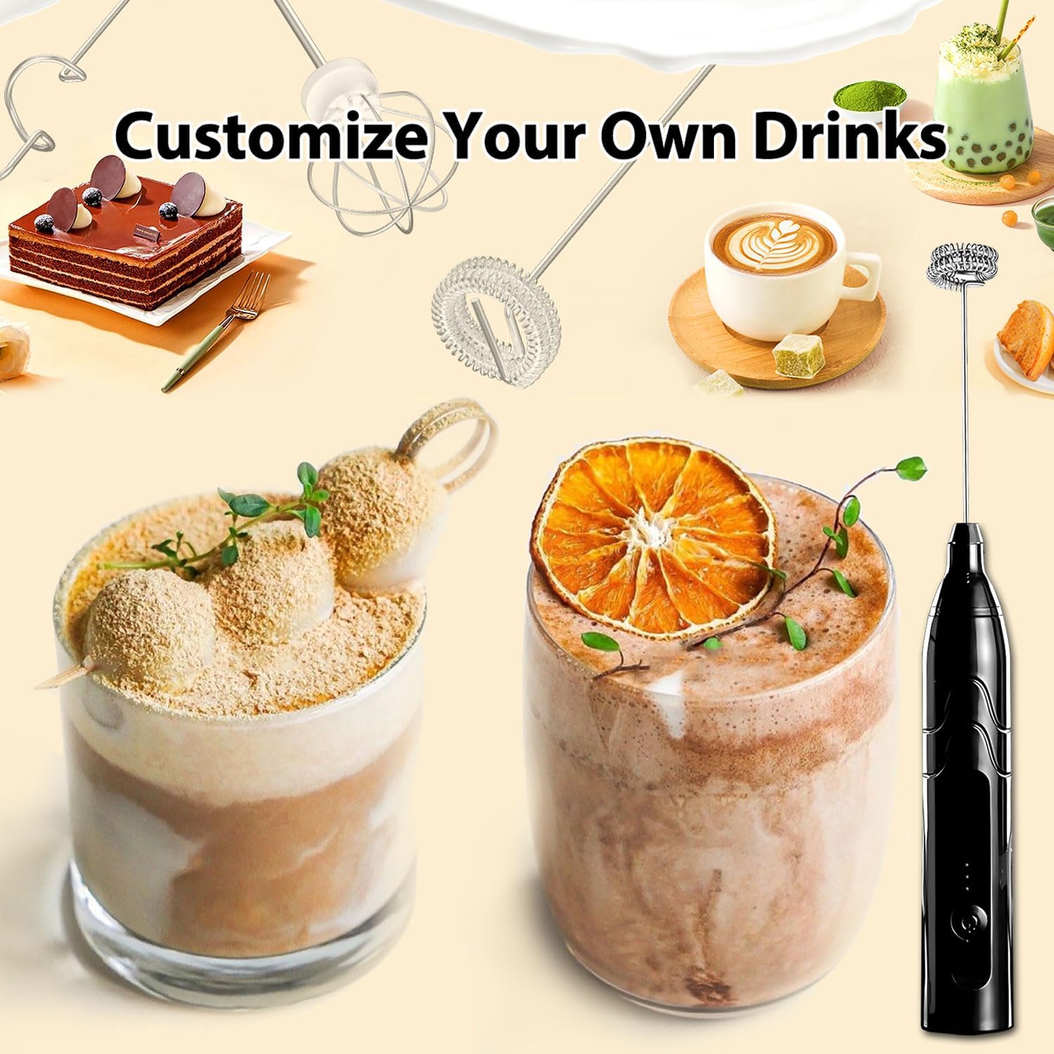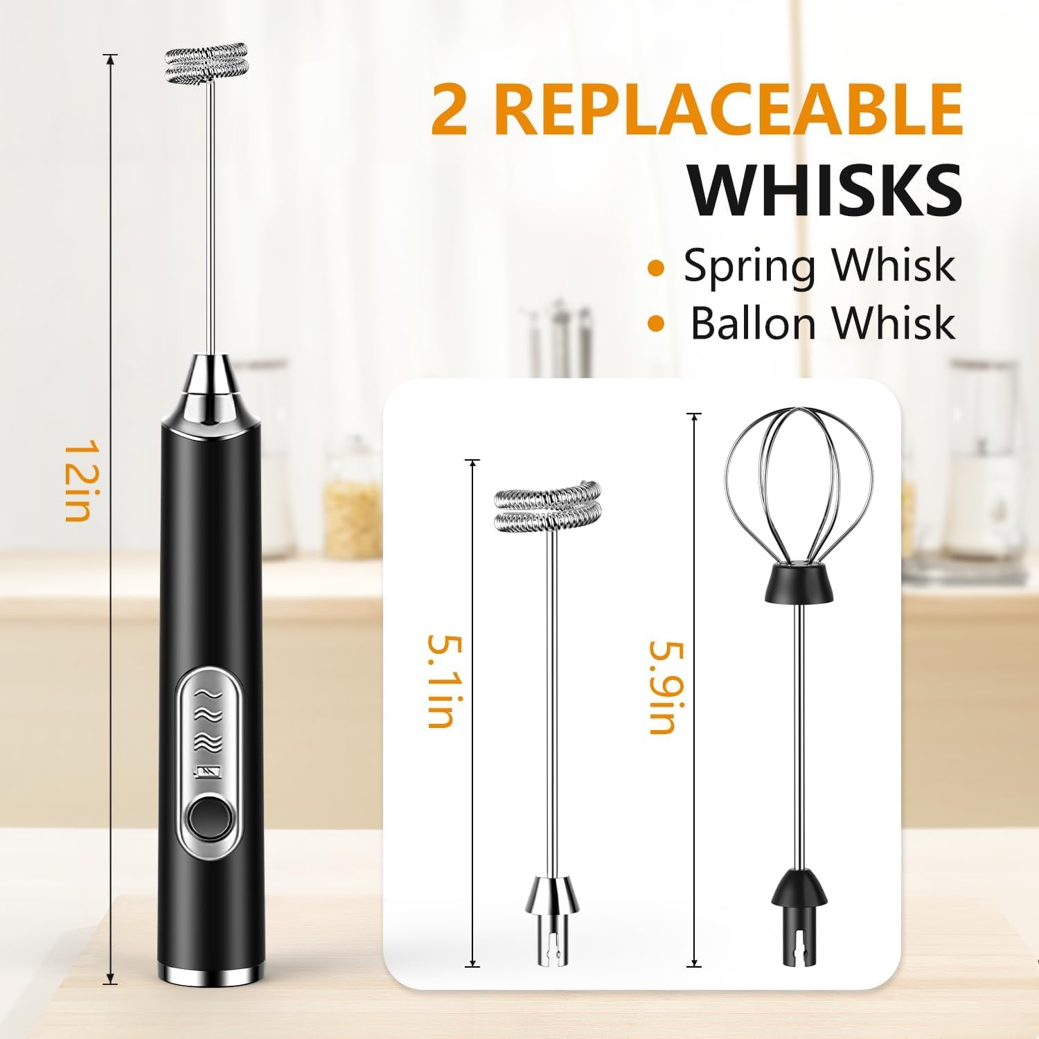 Votvy Rechargeable Milk Frother Handheld with 2 Heads, Black Color Coffee Electric Whisk Drink Foam Mixer, Mini Hand Stirrer with 3 Speeds Adjustable for Latte, Cappuccino, Hot Chocolate, Egg