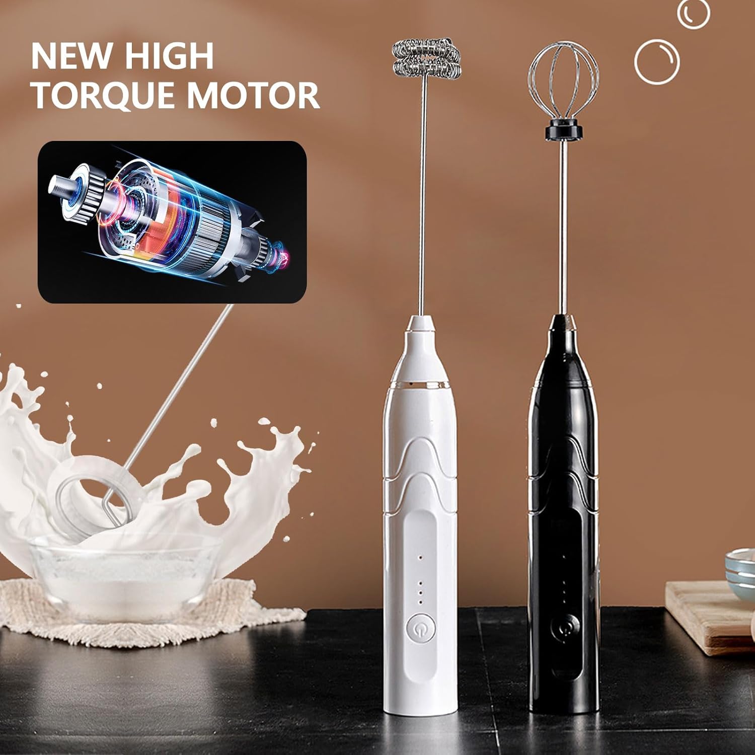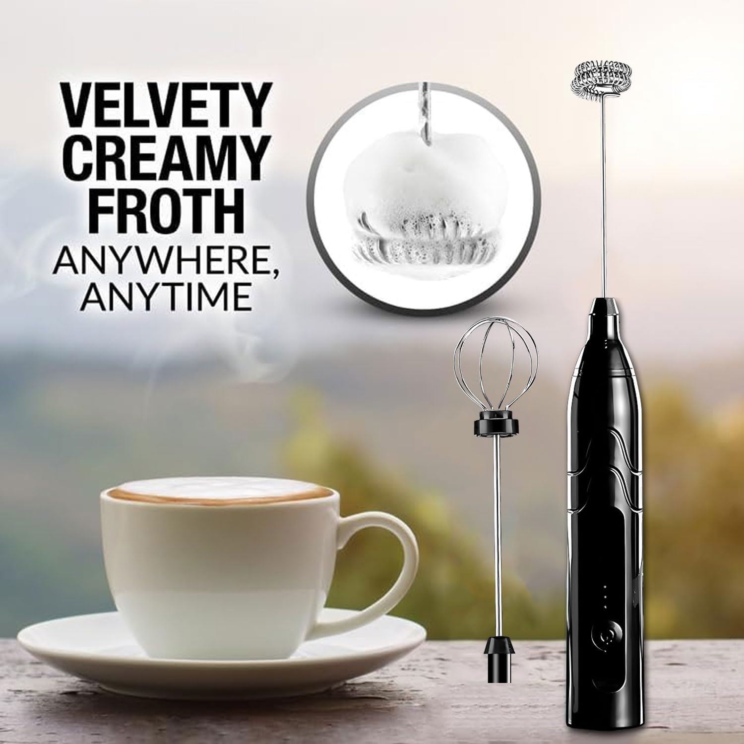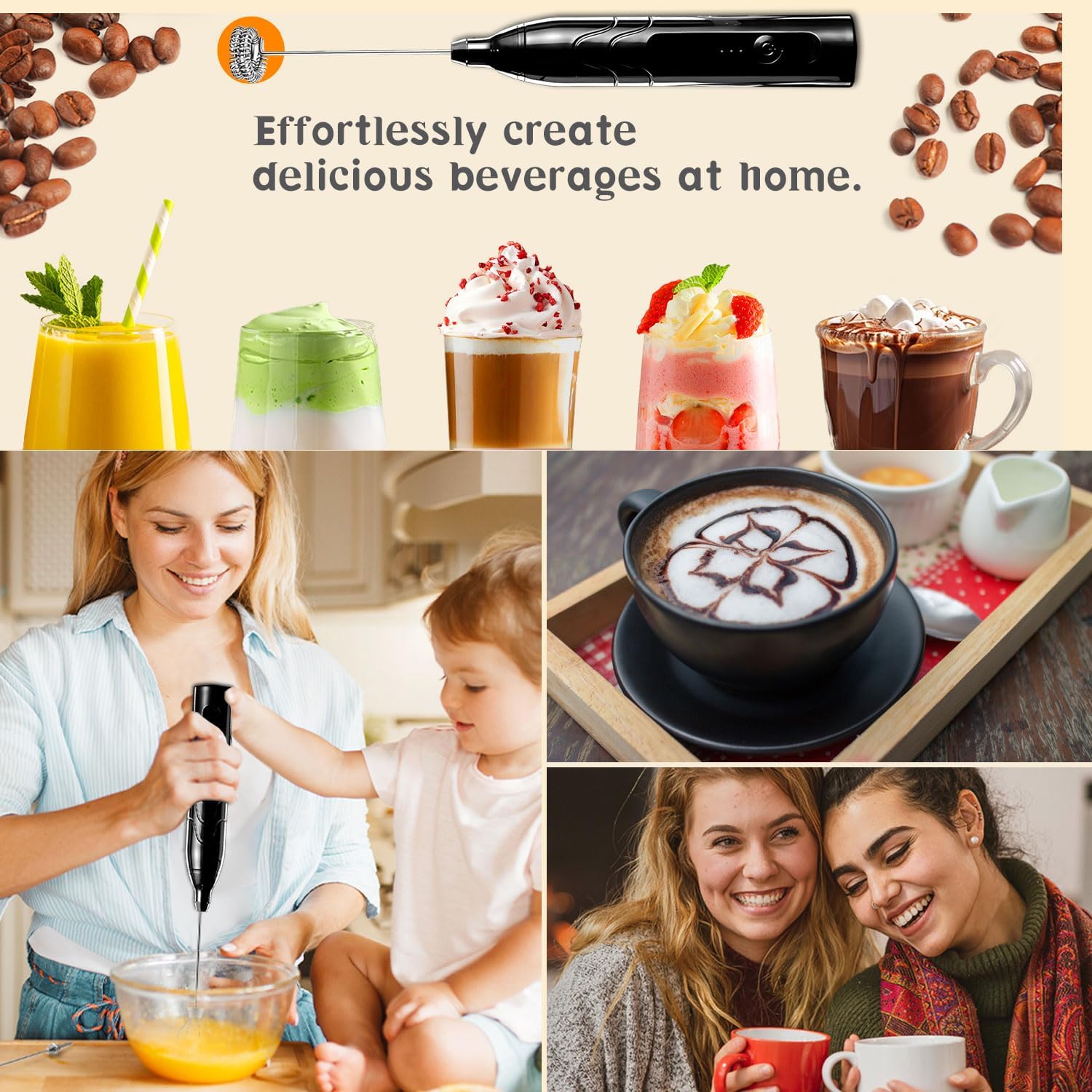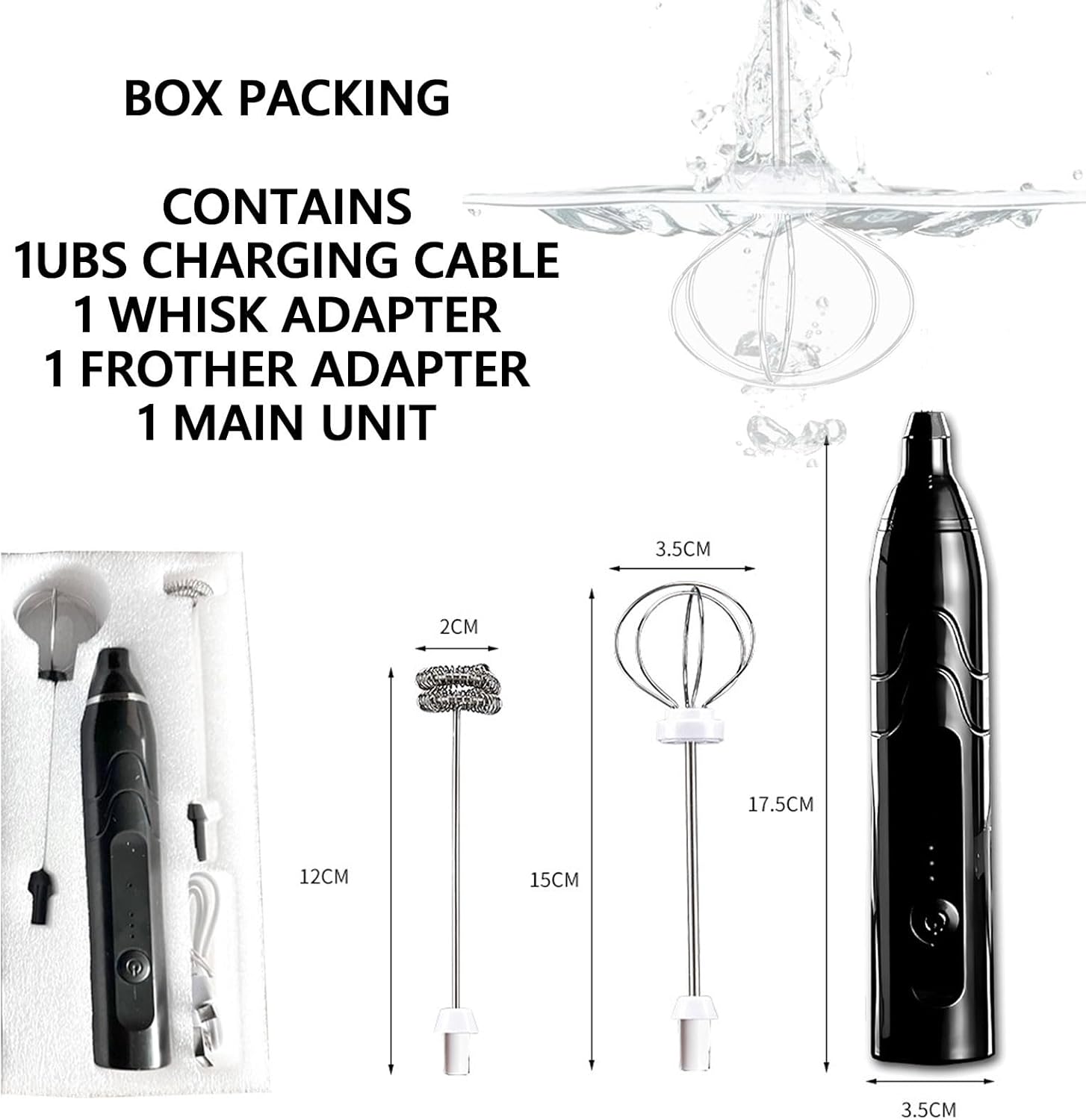 Votvy Rechargeable Milk Frother Handheld with 2 Heads, Black Color Coffee Electric Whisk Drink Foam Mixer, Mini Hand Stirrer with 3 Speeds Adjustable for Latte, Cappuccino, Hot Chocolate, Egg